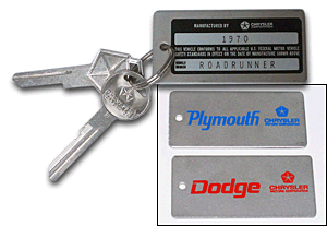 These stainless steel gems are custom ordered to exact vehicle specifications. Two versions are available. These stainless plates incorporate a miniature VIN decal on the front, accompanied by a Chrysler Plymouth/Dodge logo stamped on the back. The first version uses the model and year for its custom print. For those who really want to personalize their key tag, we provide a miniature VIN that has the exact build date and VIN number of the vehicle. This is a really unique and personalize way to keep your prize possession separate from your daily drivers!