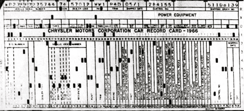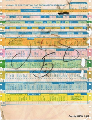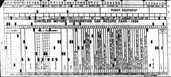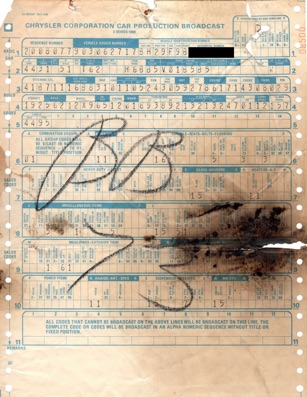 Before your car was built, an order for it was placed with Chrysler. It may have been placed by a buyer, a dealer or out of a sales bank. When the order was made, a Build Record was produced. In 1969, this was an IBM computer punch card.