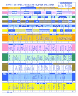 If your car is 1967 or younger, you can request the build record from Chrysler. Most after 1967 are not on file. To obtain a copy of your Build Record, send a letter requesting the Build Record to: