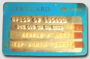 There was two line of specific vehicle information relating to the VIN, S.O., color, interior, trim level, and axle embossed on the card. Starting in 1966 the owners name and address (less zip code) and delivery date was printed on special tape that was applied to the face of the card. The tape was special Chrysler issue semi-clear label that had a Penta-Star on the label. The label was fed through a Dymo type hand help impact label maker. The original label tape was delivered to dealers in a red, white, and blue Chrysler box. The part number for the label tape is 83-100-0250. The holder stated “VEHICLE CERTCARD Do not remove for dealer use only”. Some time in mid-1967 the words "PRINTED IN USA" was added to the bottom of some CERTICARDS.