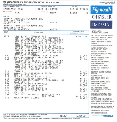 The broadcast sheet, or build sheet, has every part used to manufacture the car. The codes under each option tells everything about the car. Every option is listed on this sheet. This is an important document in validating the vehicle. The fender tag has some of the options listed depending on the plant that built your car, but without the original broadcast sheet many options cannot be proven to be original. You can find lists of these codes in the widely known “White Books” produced by Galen Govier, which can be purchased at a variety of places, including eBay and Mopar shows.