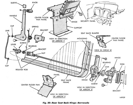 To install the rear seat, bottom part goes in first, it hooks on the bottom then has 2 bolts on tabs at the rear bottom. Then the top rear seat gets 2 bolts on each side. Some cars had two shim packs that go between seat back hinge and the body for alignment as well. Covers on the hinges are installed lastly.